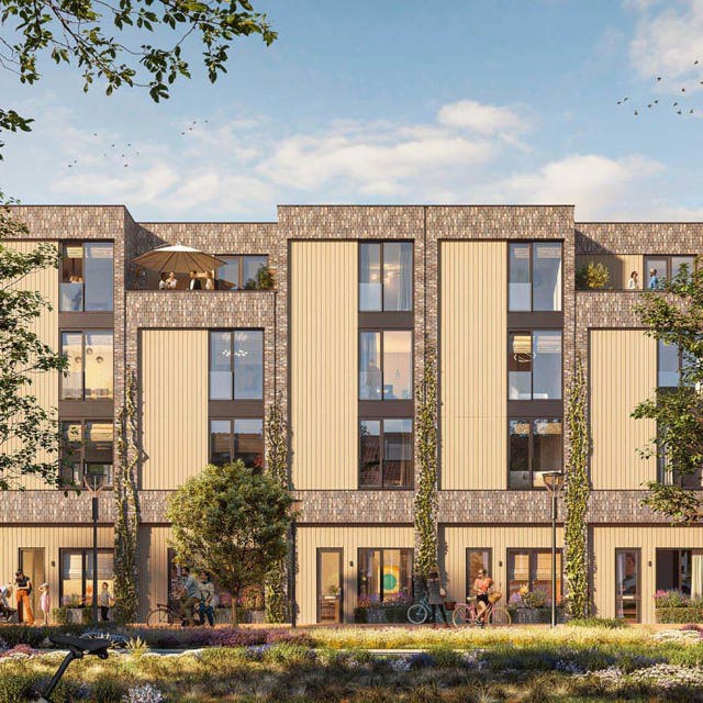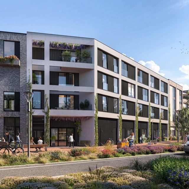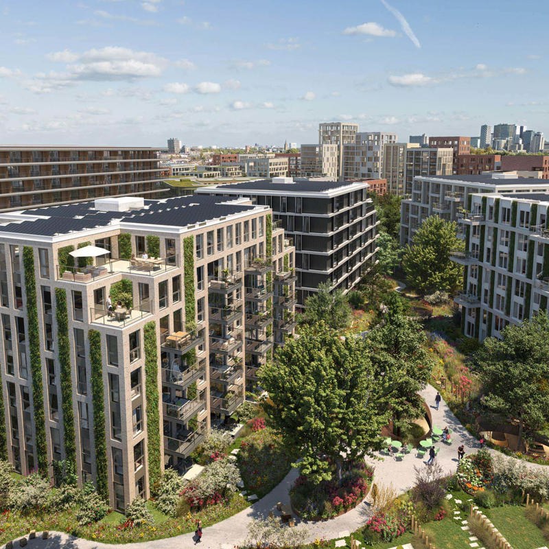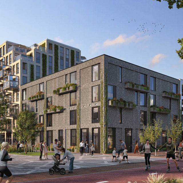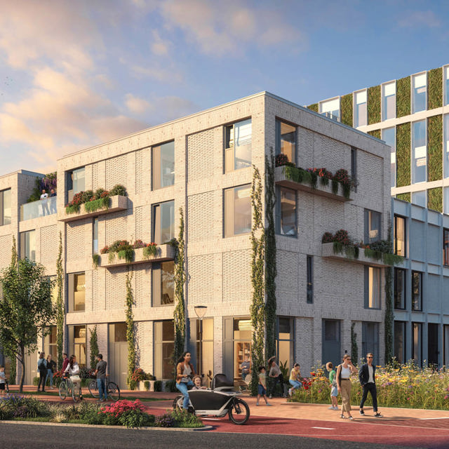 - Alle stadswoningen hebben een groen sedumdak en de appartementengebouwen een klimaatadaptief wit dak om in de zomer te zorgen voor een aangename temperatuur.