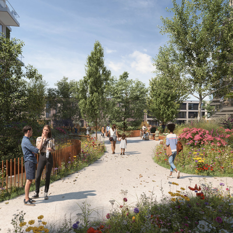 - De binnentuin van circa 3.700 m² biedt privacy en verbindt de mens en natuur. Met mooie wandelpaden en zitelementen om elkaar te ontmoeten.