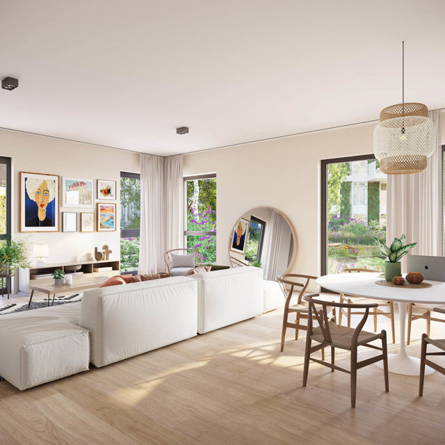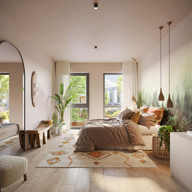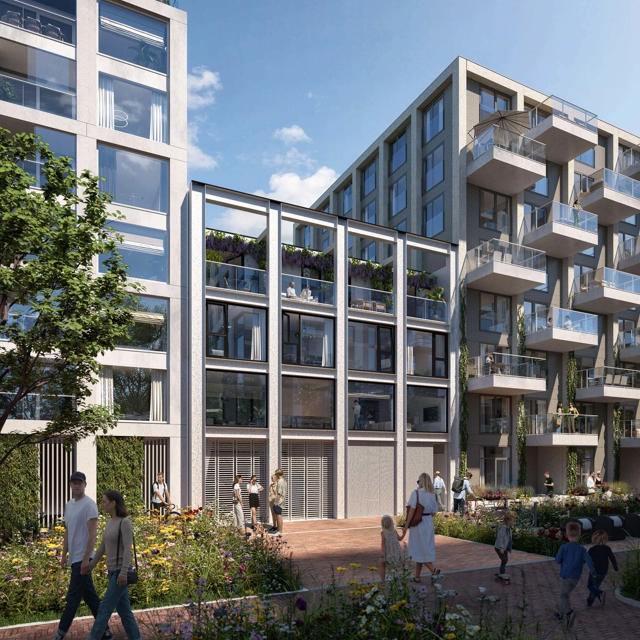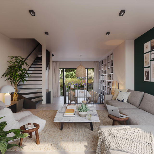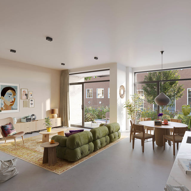 - De stadswoningen hebben een privé tuin die organisch overloopt in de grotere binnentuin waardoor de beleving van veel groen in de binnenstad wordt versterkt.