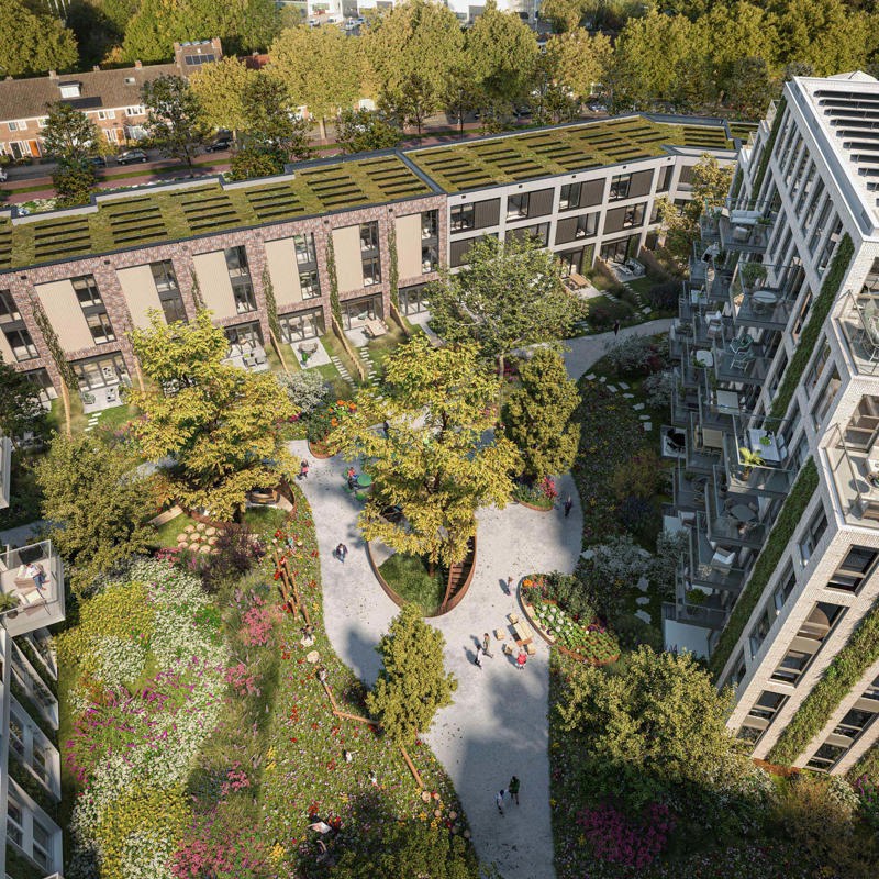 - De binnentuin is een echte biotoop die in samenwerking met de stadsecoloog en de Mecanoo voor de landschapsarchitectuur is ontworpen. Inheemse planten zijn zorgvuldig uitgekozen om privacy te bieden aan bewoners en ontspanning voor passanten. Er komt een parkeergarage die is geïntegreerd in de binnentuin. Bomen groeien letterlijk vanuit de parkeergarage de lucht in. Via een prachtig ontworpen toegang loopt je zo naar de groene binnentuin.